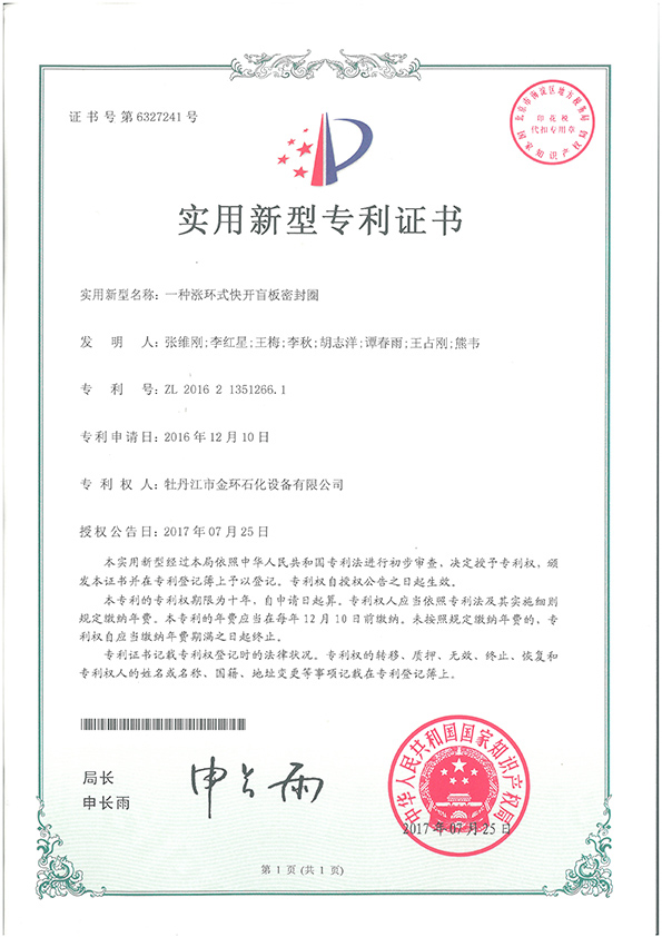 一種漲環(huán)式快開盲板密封圈實(shí)用新型專利證書ZL 2016 2 1351266.1